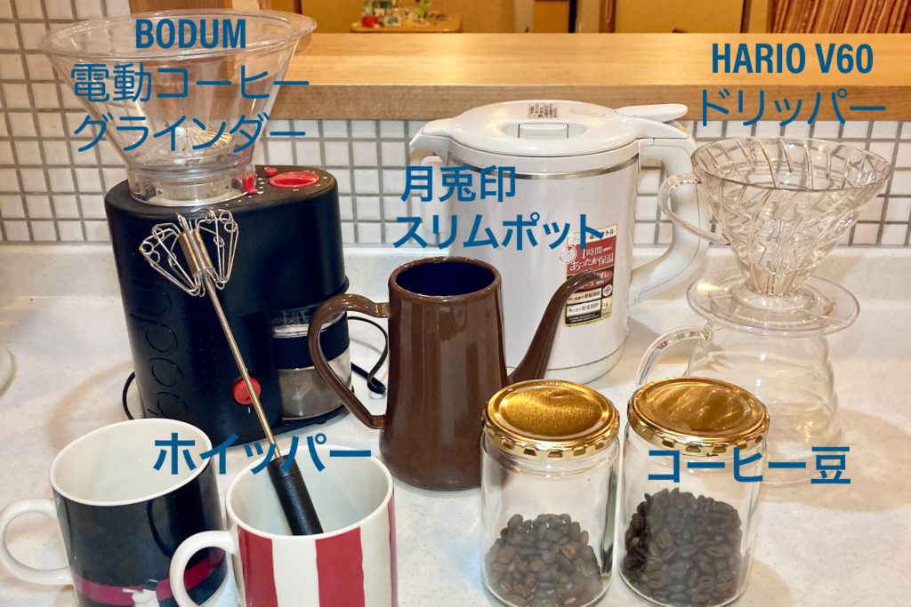 ②コーヒードリッパー、コーヒーフィルター、コーヒー豆、ポット、マグカップ、ホイッパーを準備する。