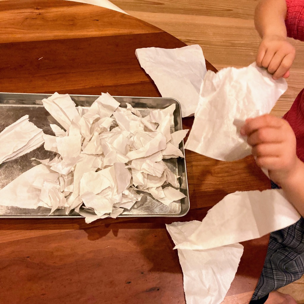 新聞紙やざら紙(わらばん紙)を5から10cm程度にちぎる。適当でOK。
