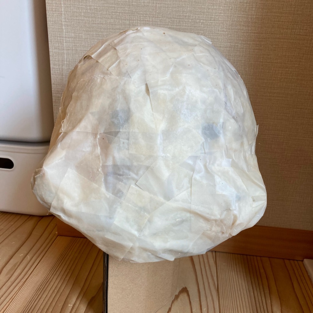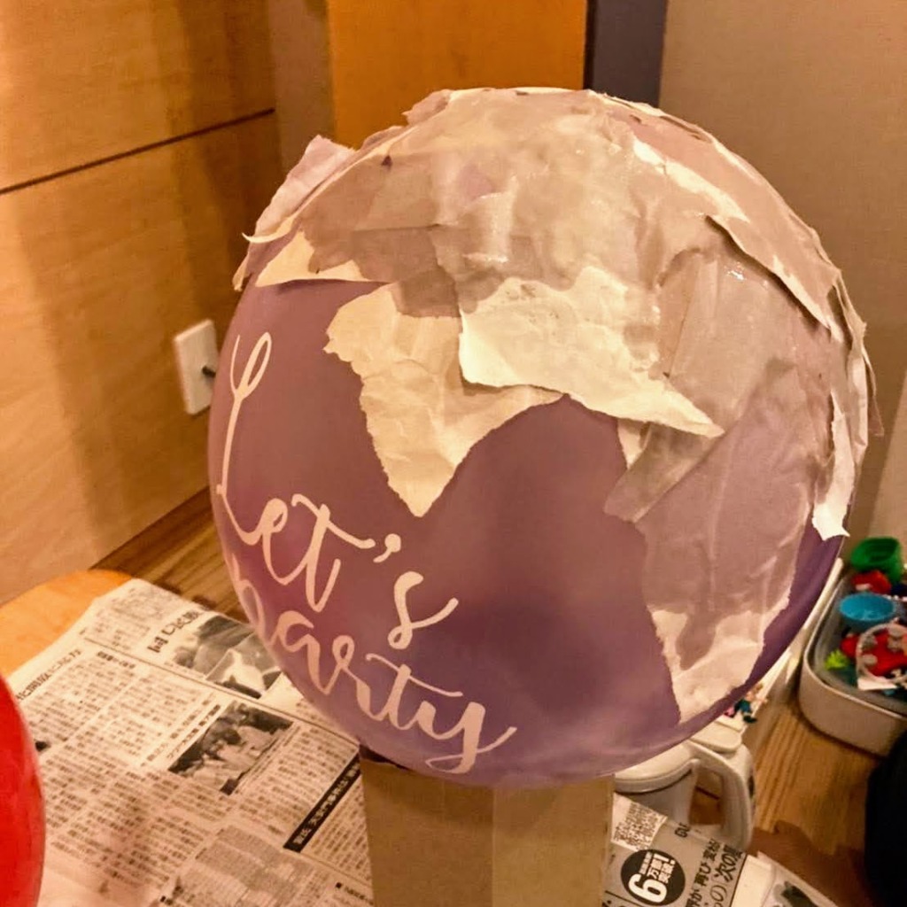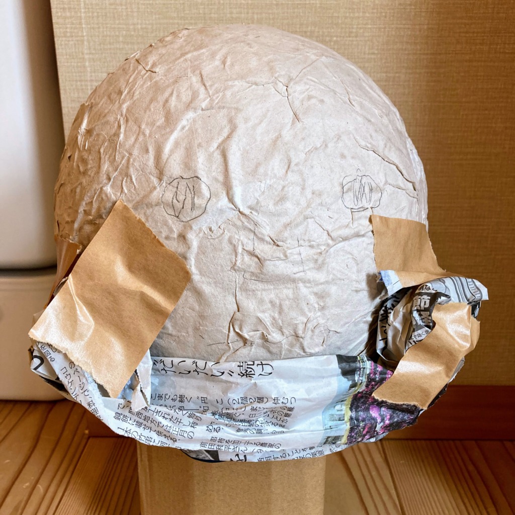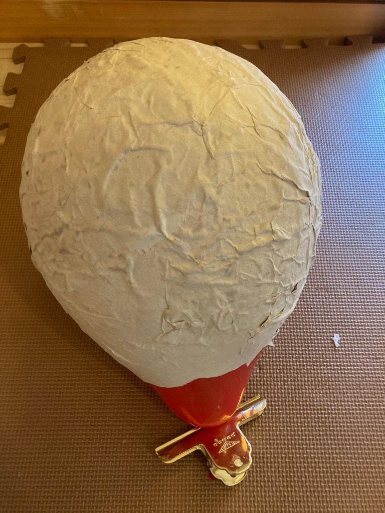 風船の下の方までしっかり紙を貼ります。頭を入れる部分は後から切って作ればOK。被った時に顔が隠れるくらいしっかりと下まで紙を貼ること。