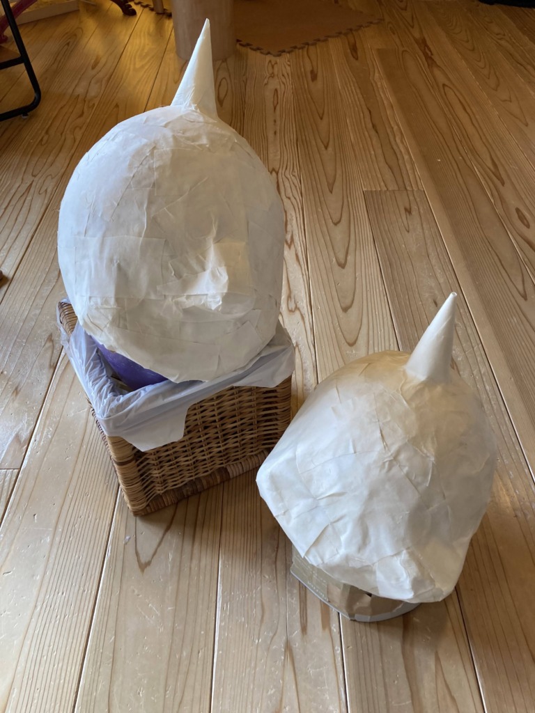 劇の小道具などに被りものから、小道具制作にも応用出来ます。紙と絵の具で作れますので、自由に作れて、軽い点もポイントです。